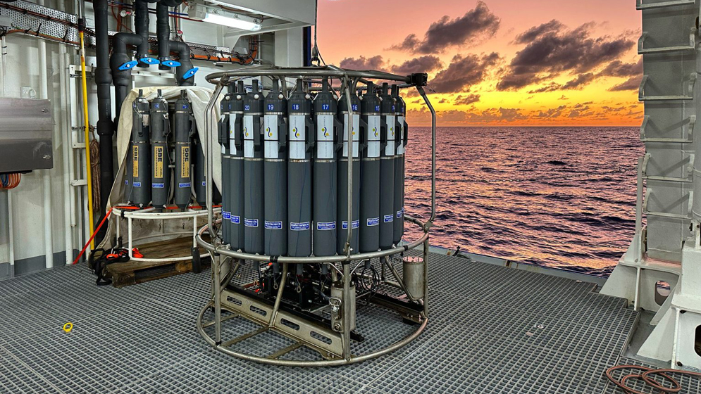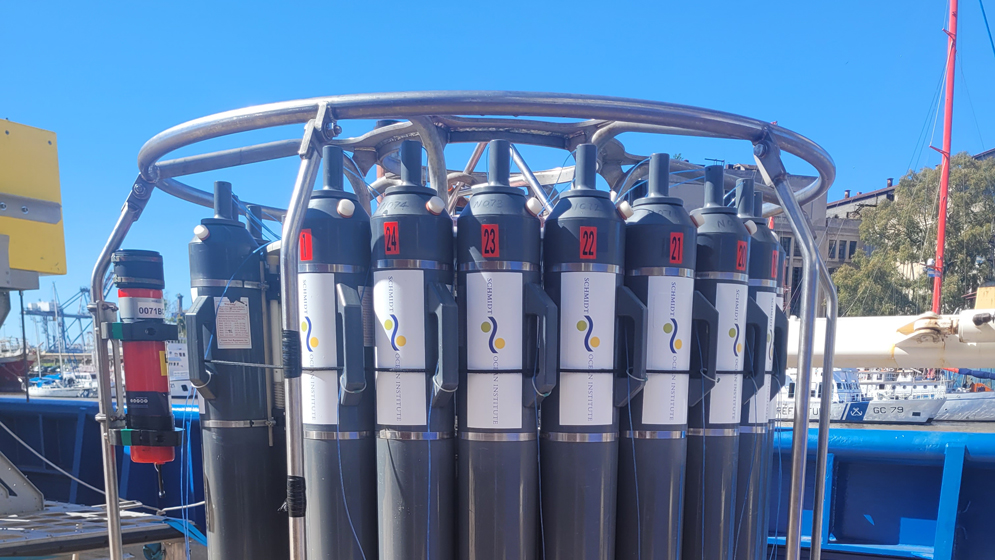 Instrumento para la medición de los parámetros conductividad, temperatura y profundidad (CTD), y otras propiedades hidrográficas del agua. Créditos: Schmidt Ocean Institute