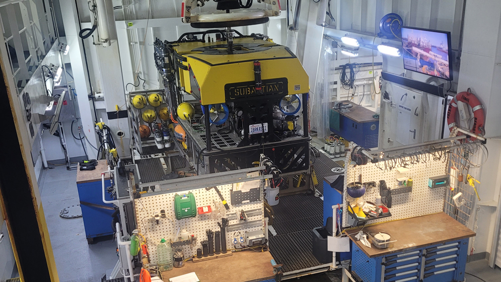 El vehículo operado remotamente (ROV, por sus siglas en inglés) SuBastian en el hangar del buque Falkor (too). Créditos: Schmidt Ocean Institute.
